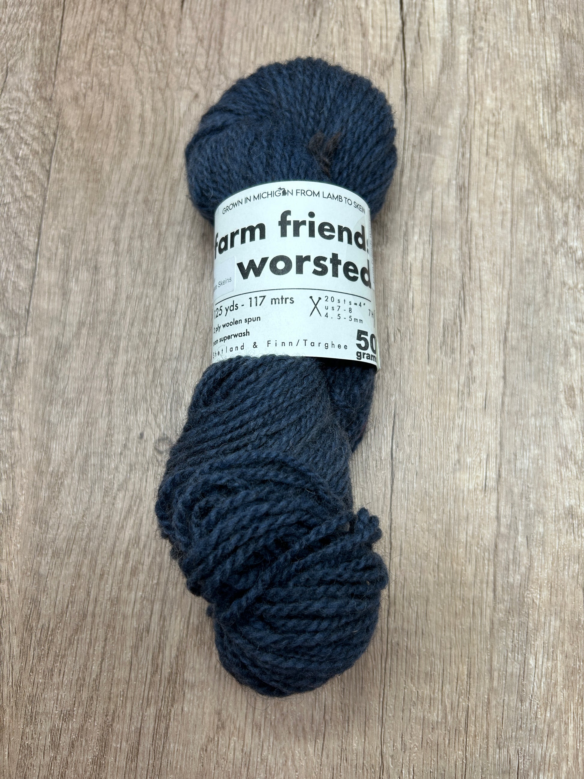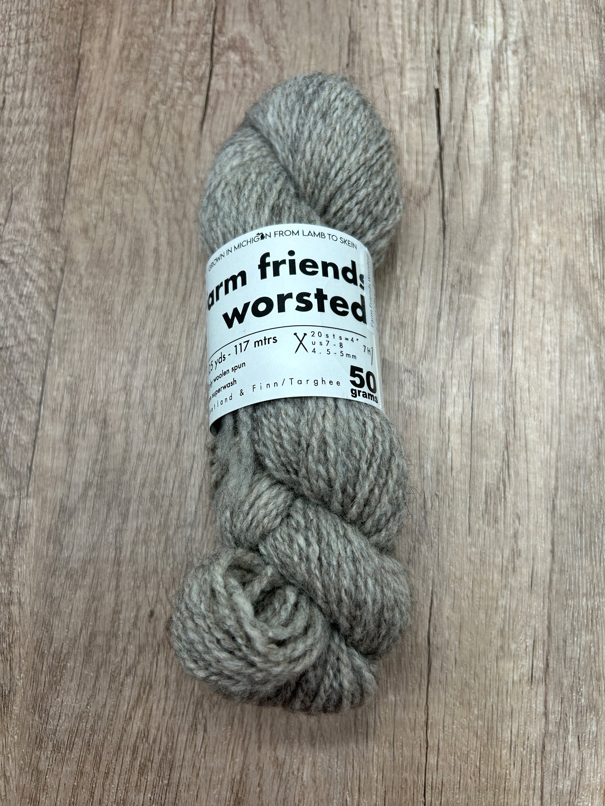 The Farm Friends is a 2 ply, woolen spun yarn made from the original flock at Mitchell Wool Co. The fleece of Heidi, Minnie Purl, Olaf, Rosa Parks, Annie, Loretta, Patsy Cline, and RBG all went into create the heather base, Lambs ear. Cindy dyed the other colorway all with plants.