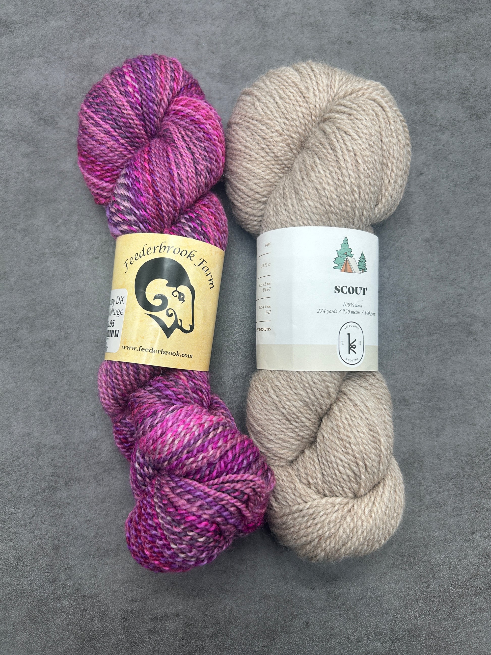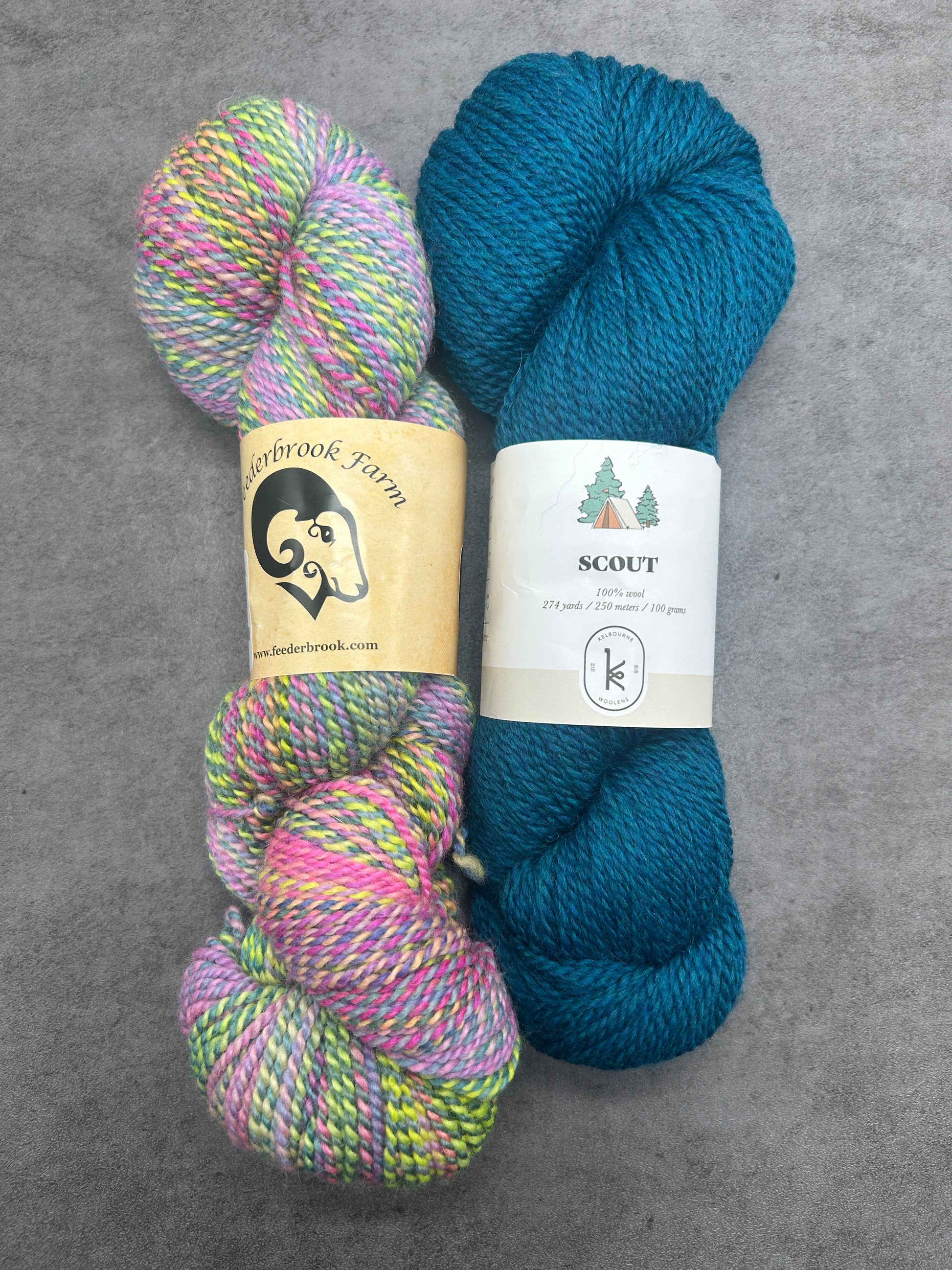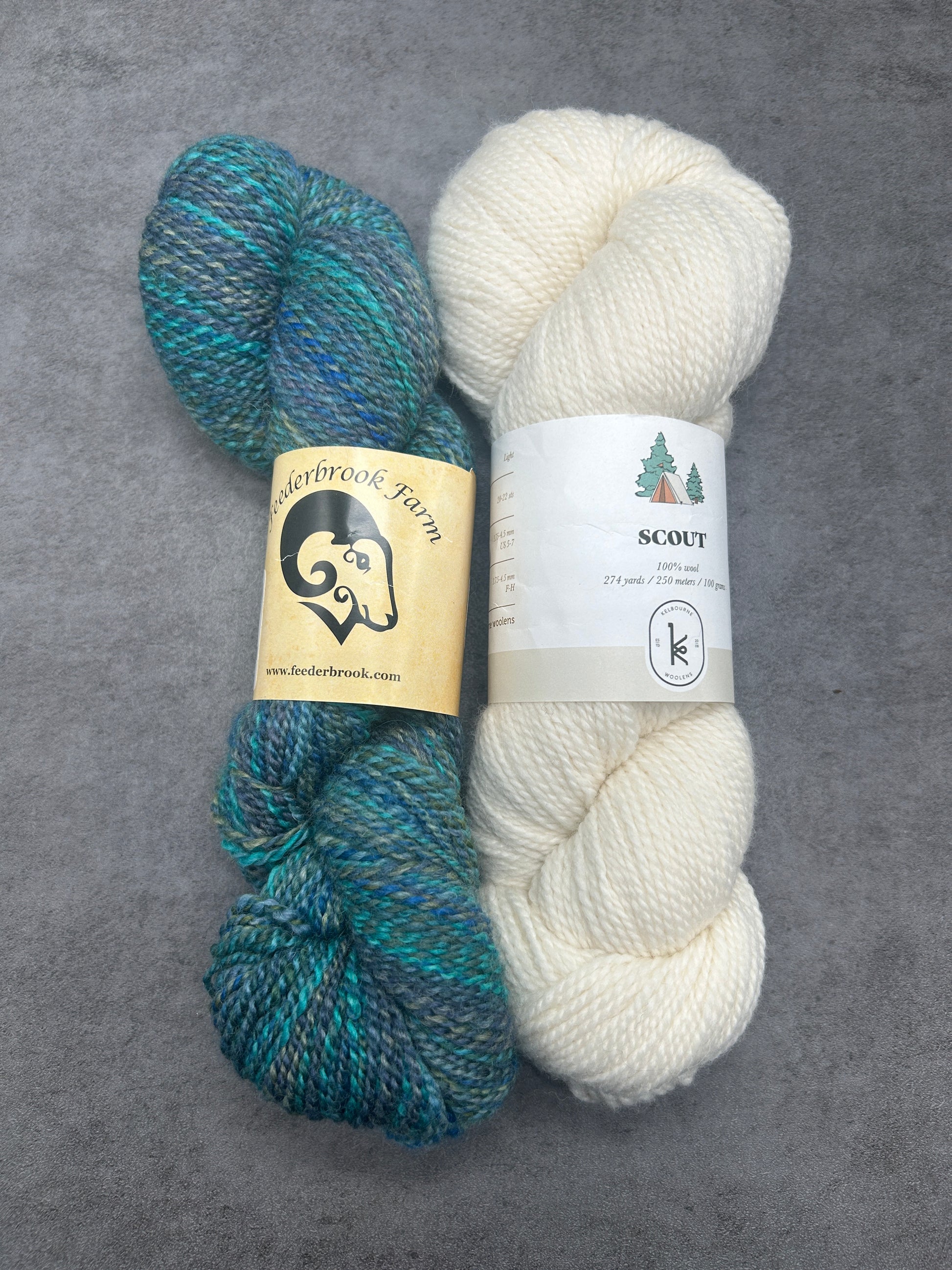 Kit #2 - #5 contains one skein of Scout by Kelbourne Woolens (274 yards of 100% wool) and one skein of Entropy DK by Feederbrook Farm (260 yards of 100% bluefaced leicester).