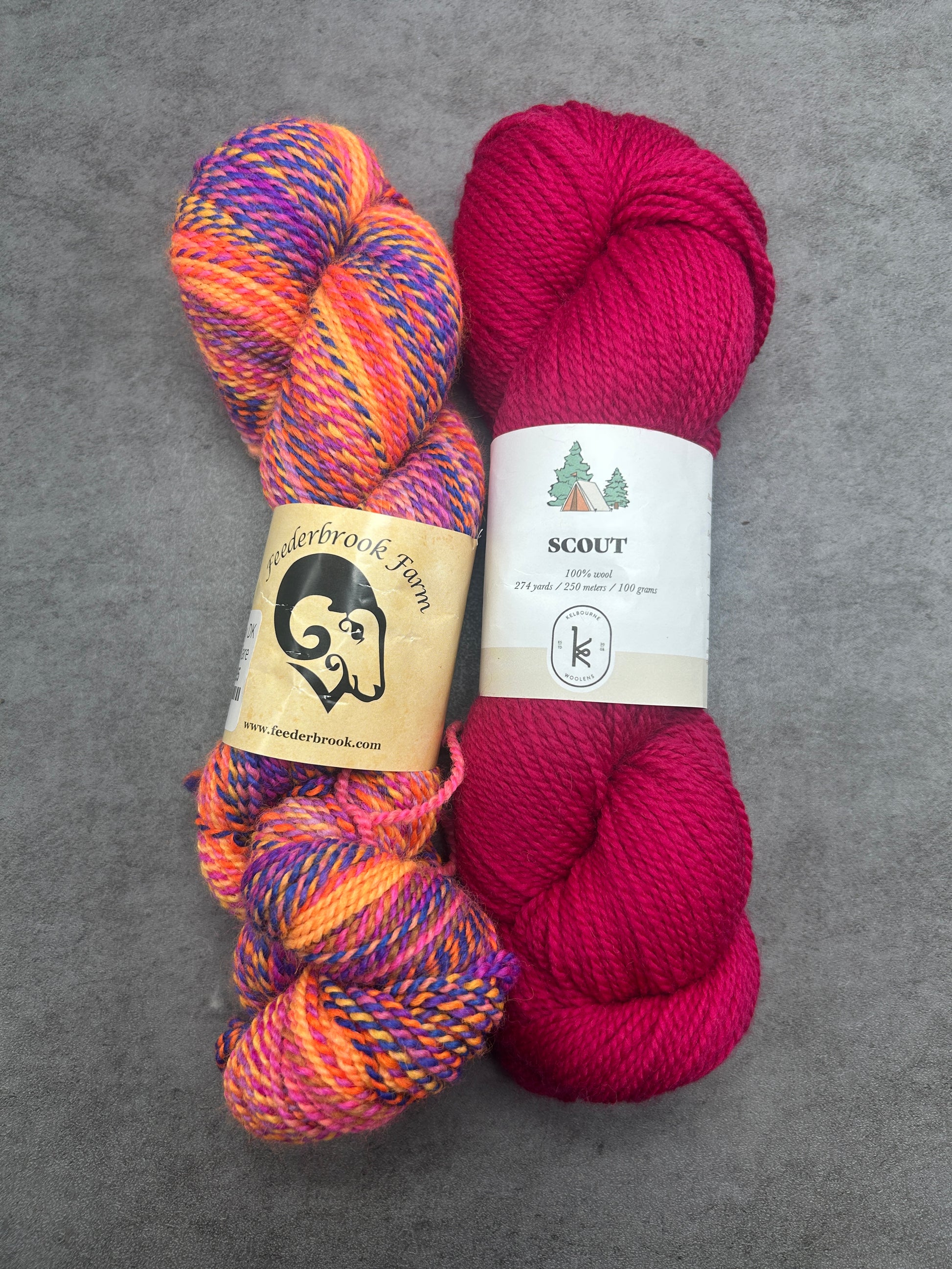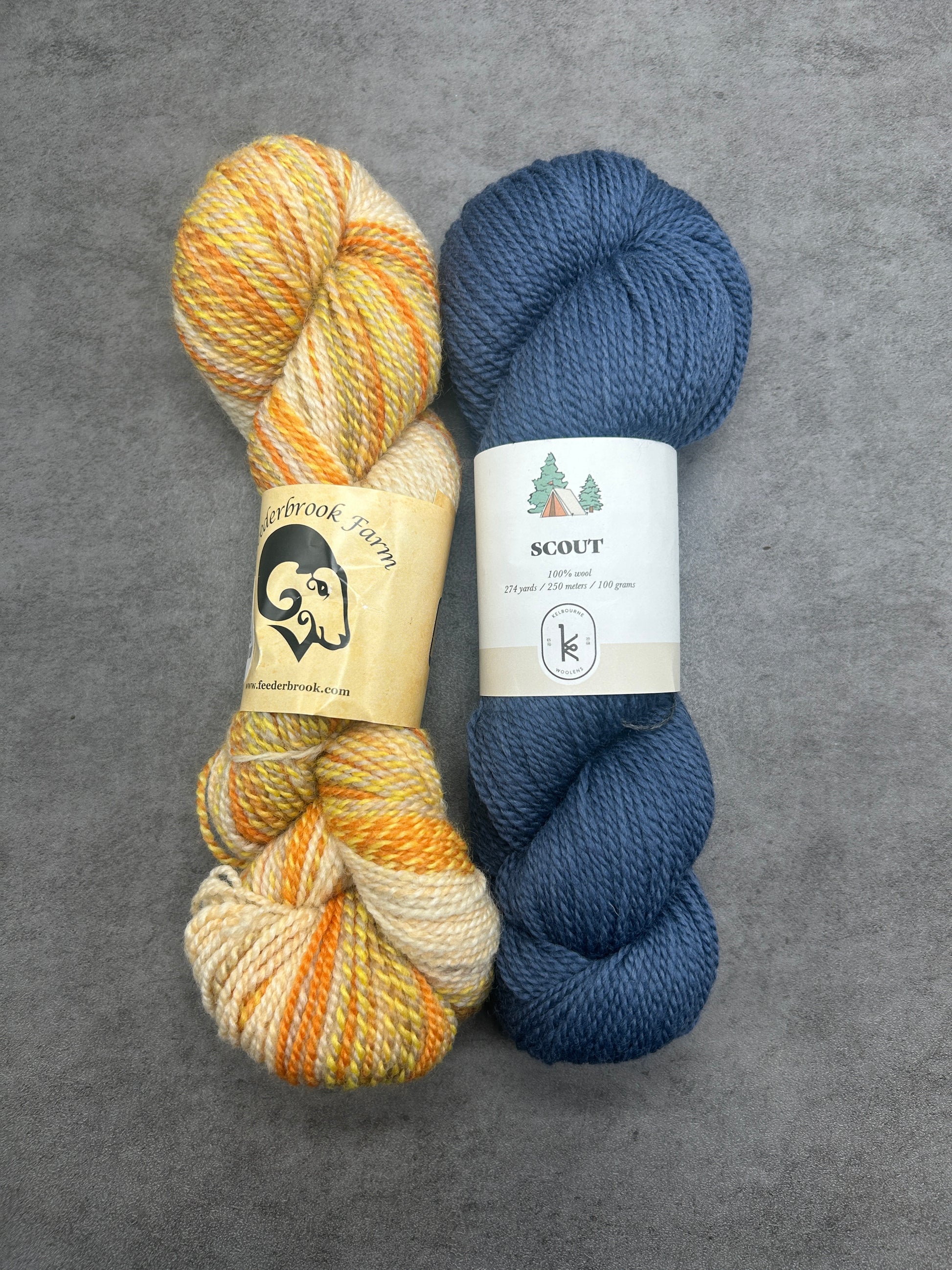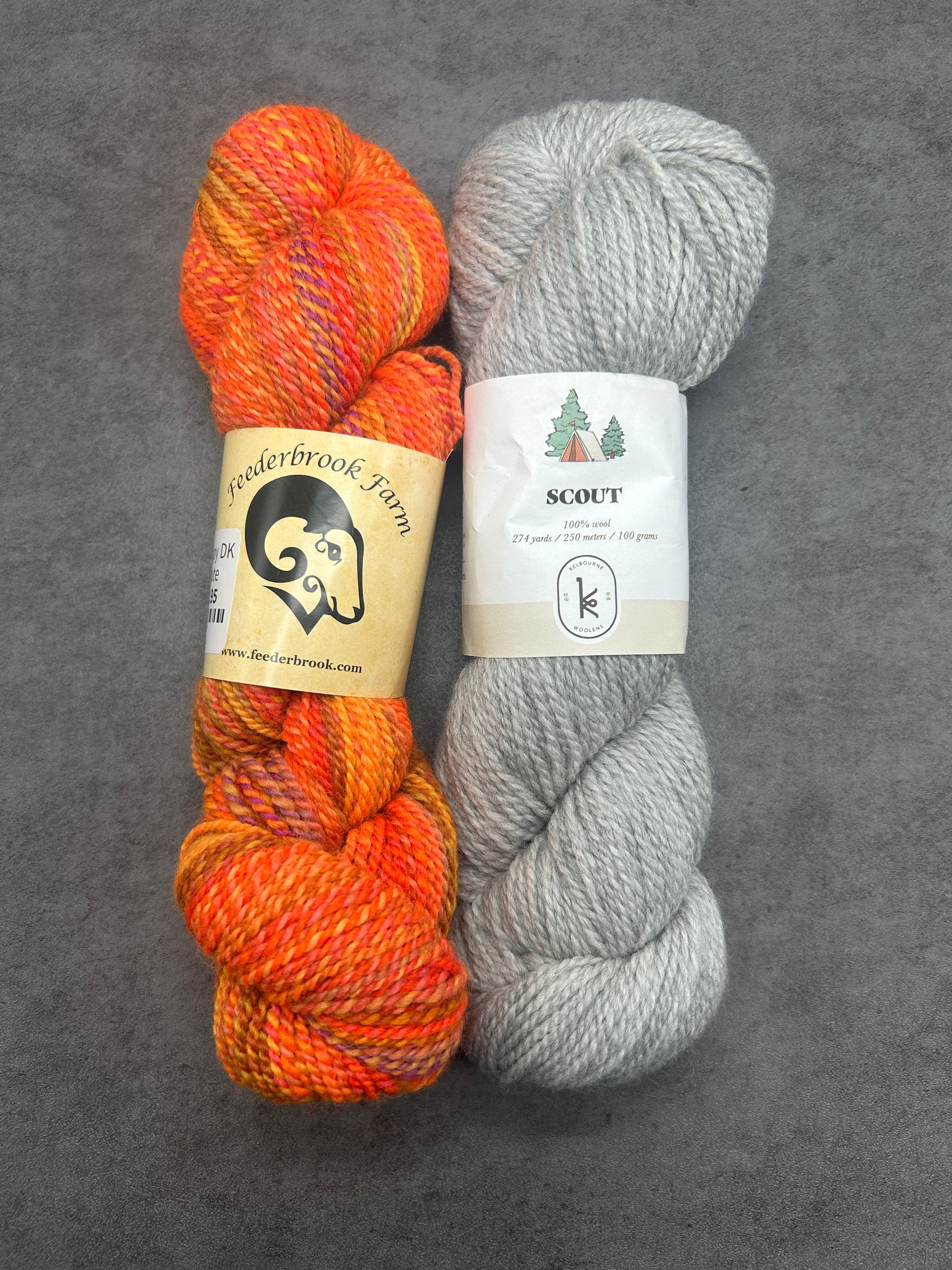 Kit #2 - #5 contains one skein of Scout by Kelbourne Woolens (274 yards of 100% wool) and one skein of Entropy DK by Feederbrook Farm (260 yards of 100% bluefaced leicester).