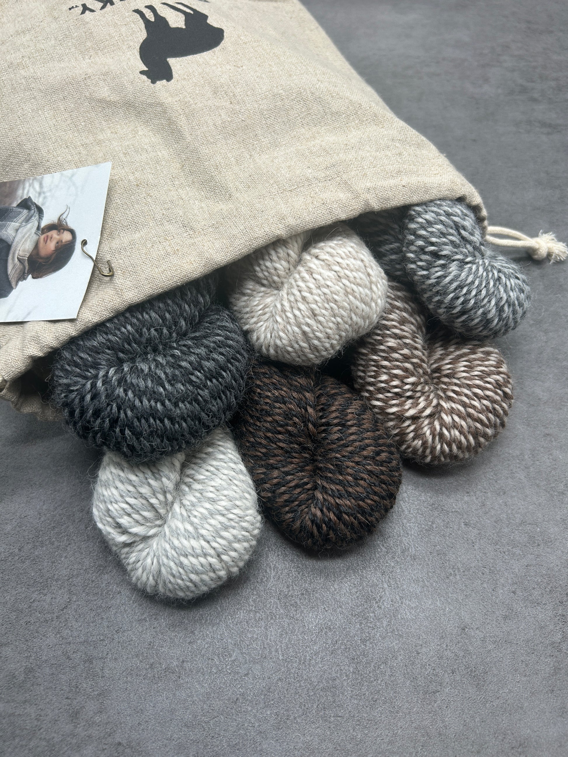 Each kit contains 6 different colors of Baby Alpaca, a canvas project bag, and a printed copy of the pattern.