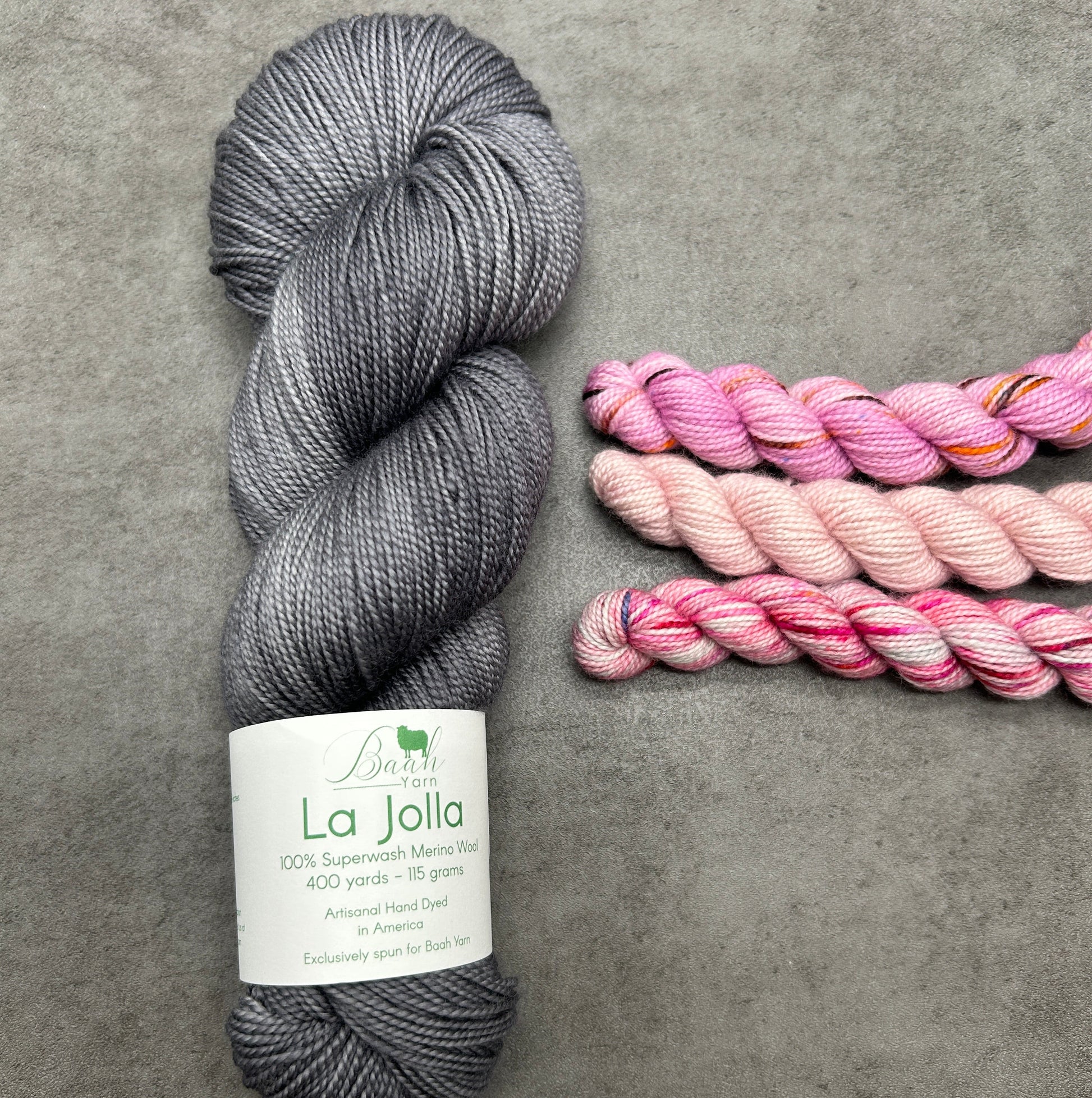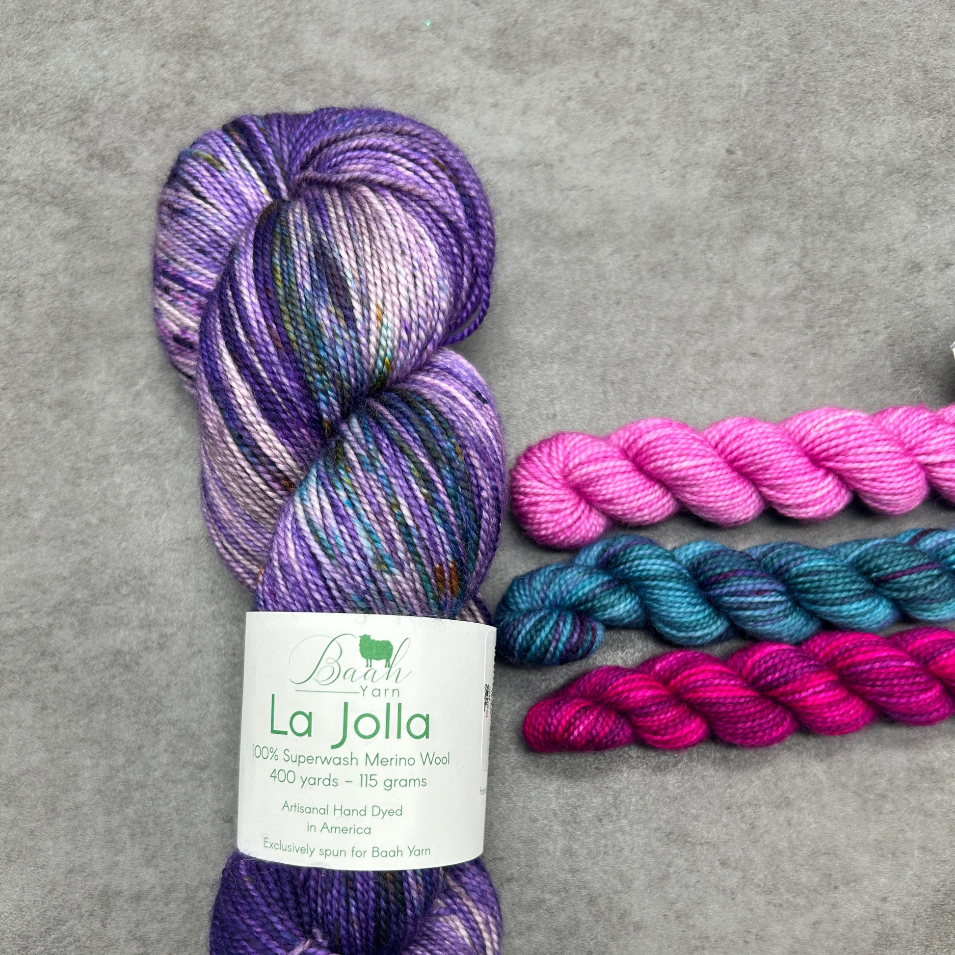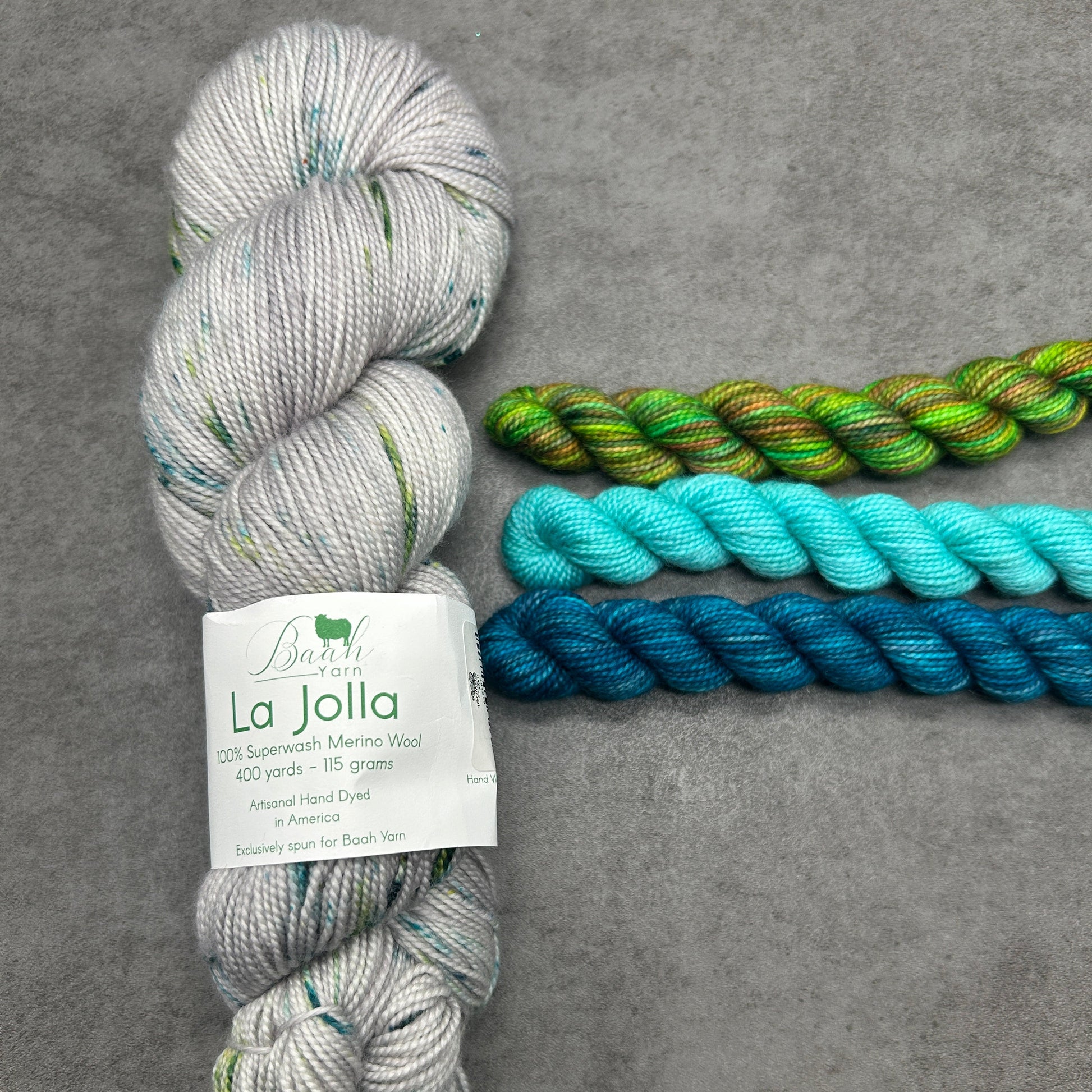 Baah La Jolla fingering 400yds of 100% Superwash Merino, Baah Babies 52yds of 100% Super Wash Merino.