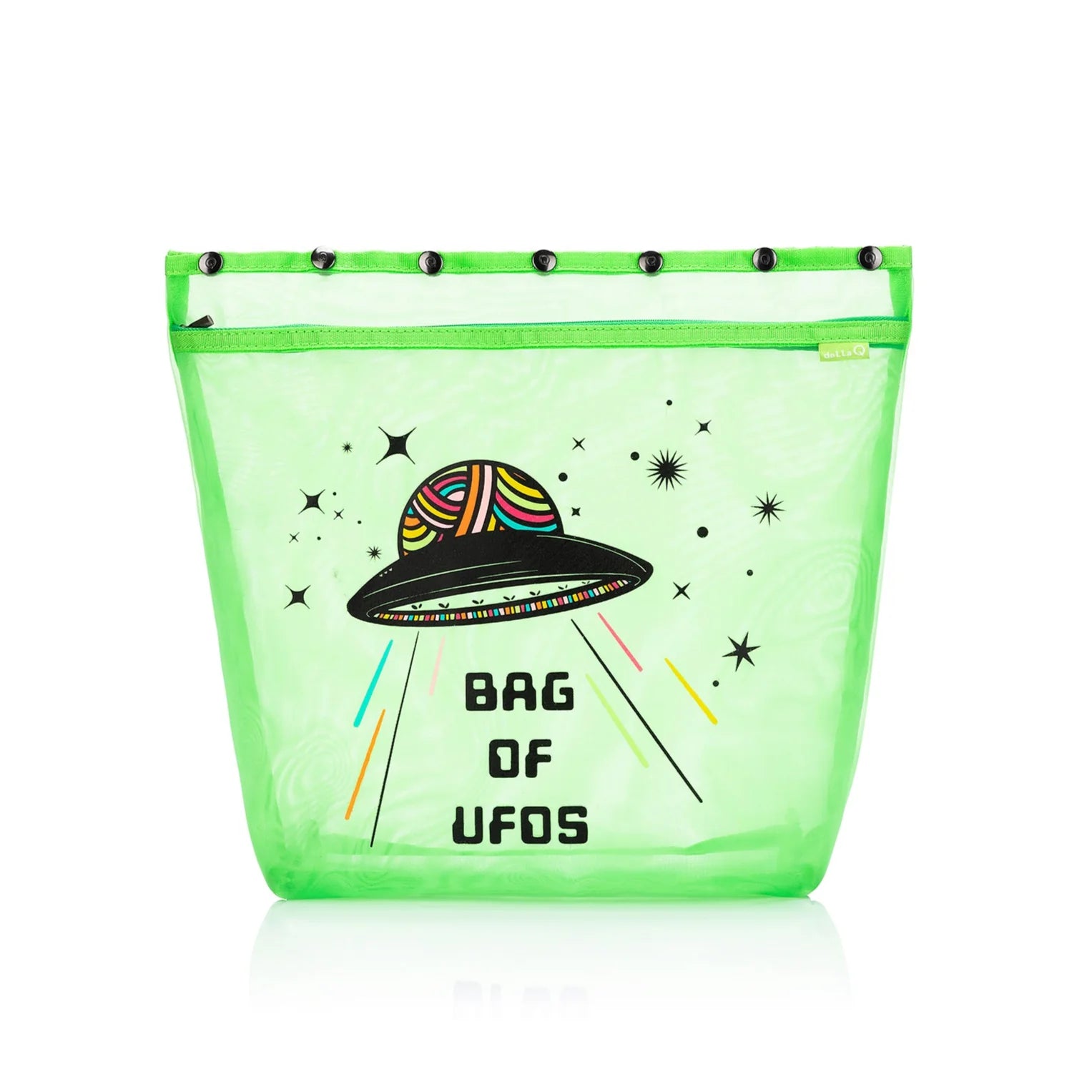 Featuring a bright green mesh, this bag is perfect for crafters who love a pop of color and a bit of intergalactic flair. The bold "Bag of UFOs” print, complete with a yarn-filled flying saucer, makes this bag a must-have for knitters and crocheters with a few too many projects on their needles and hooks (no judgment—we’ve all been there!).