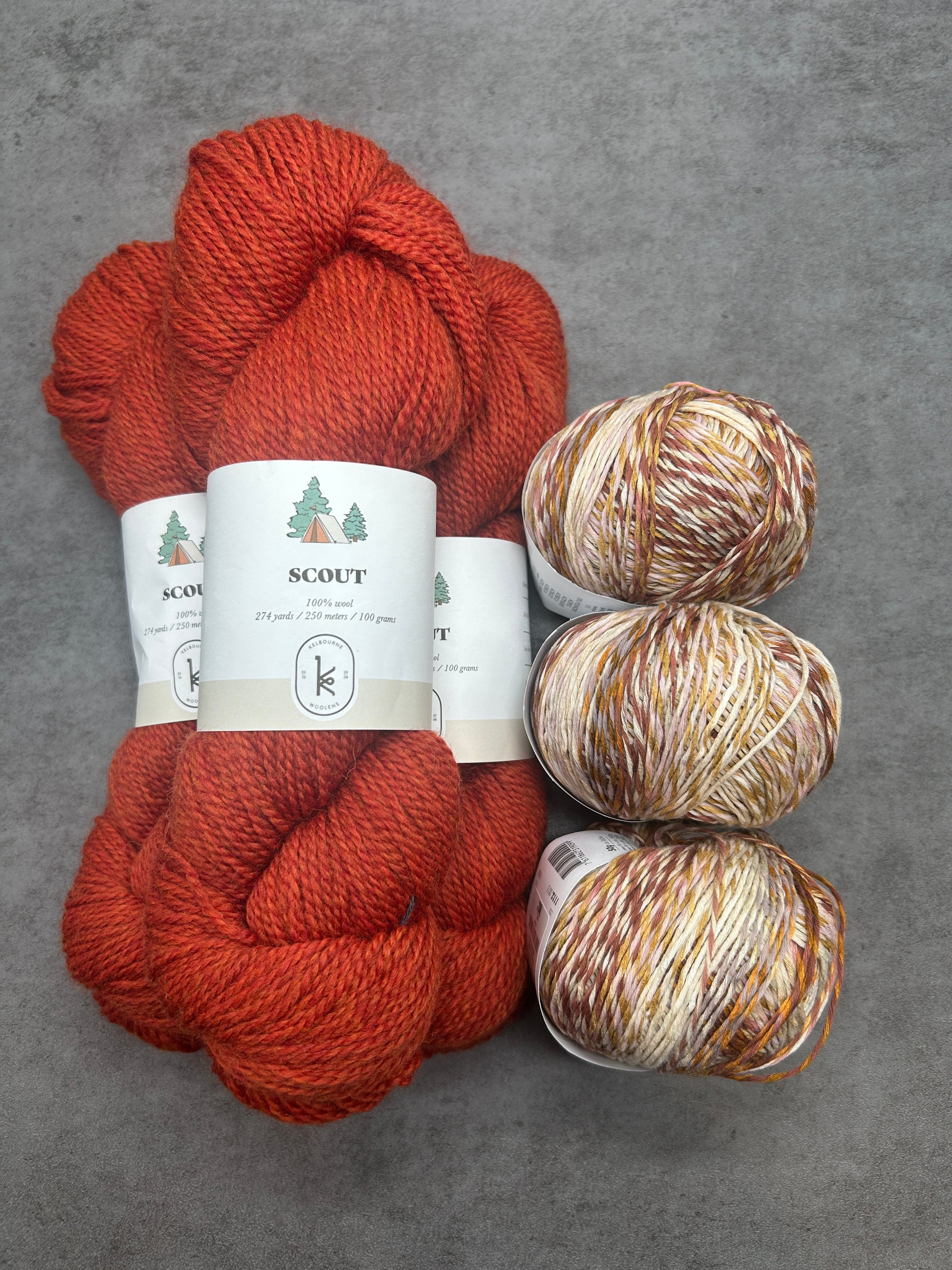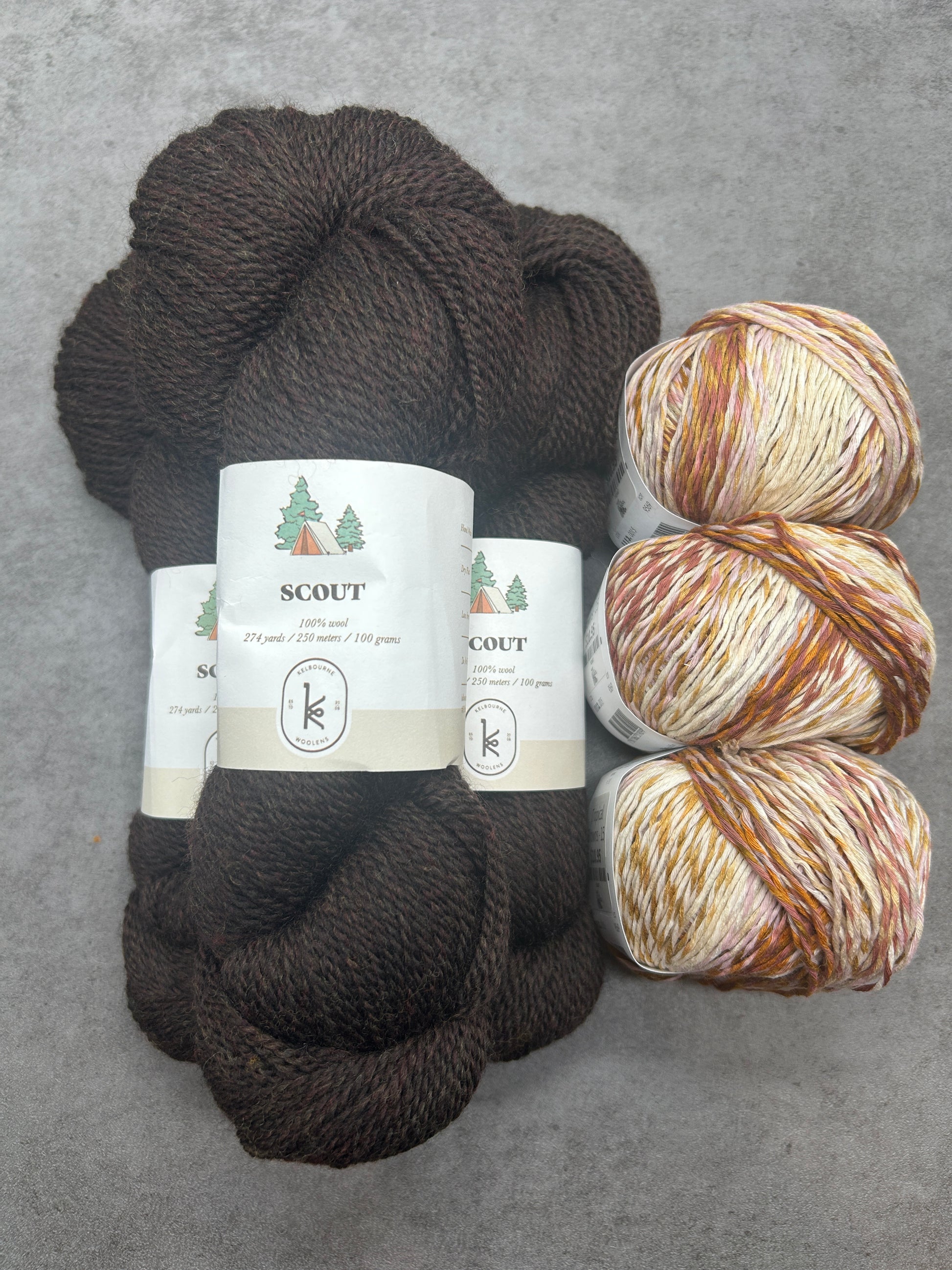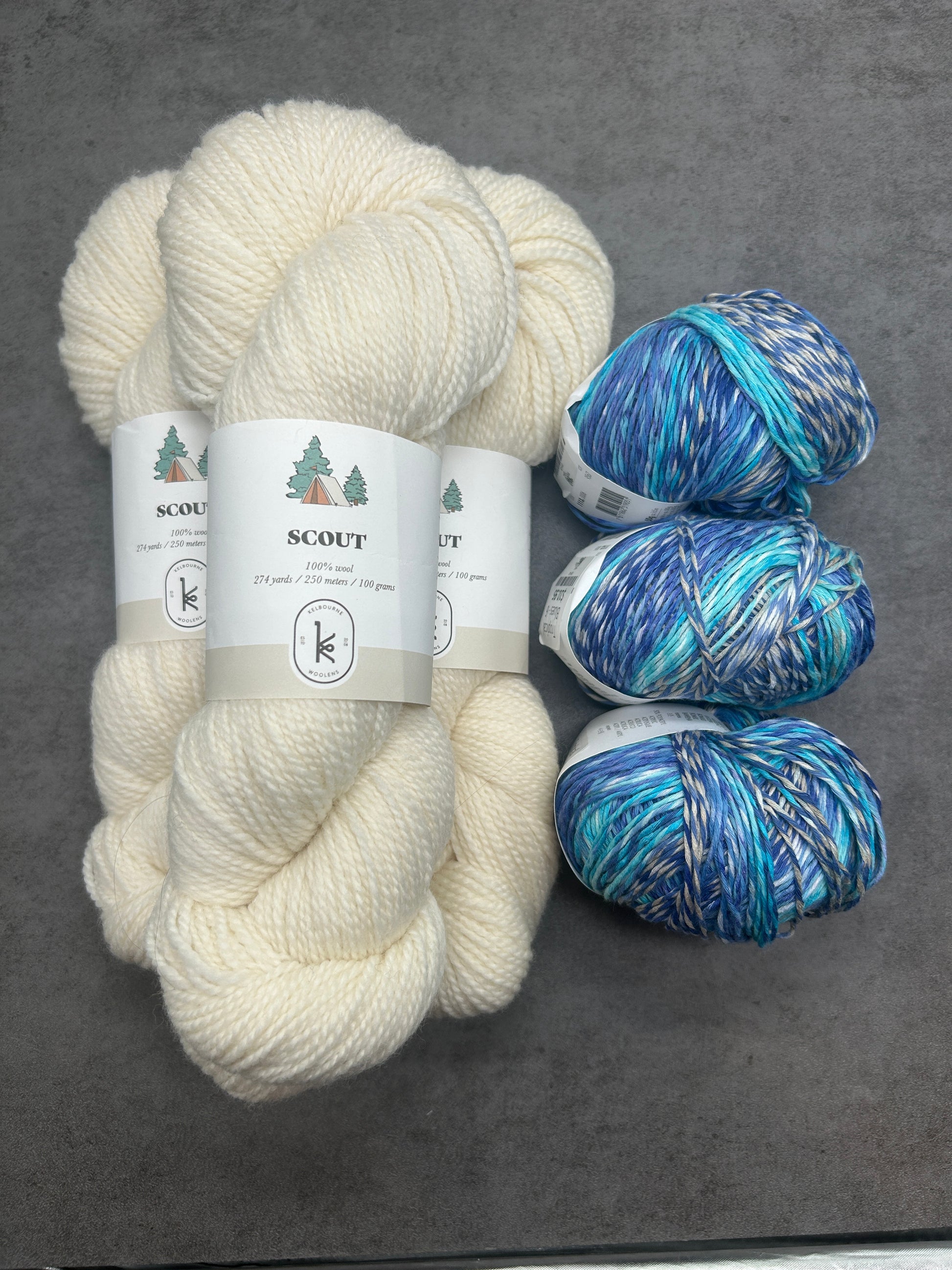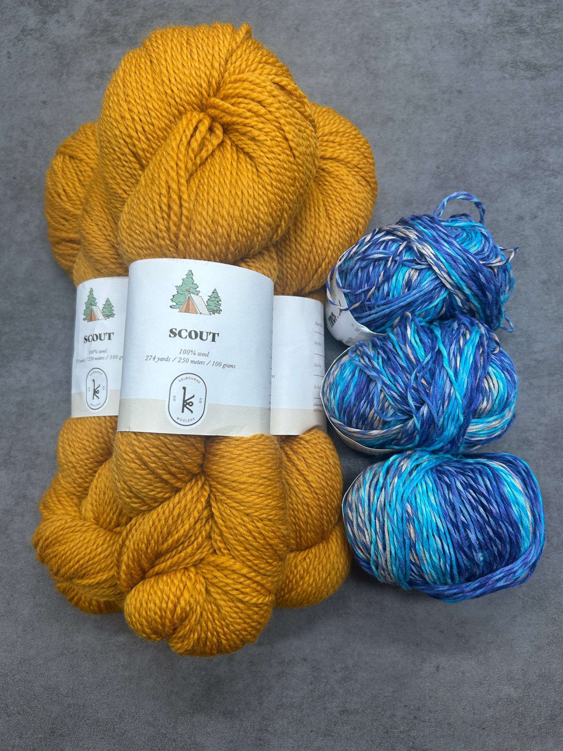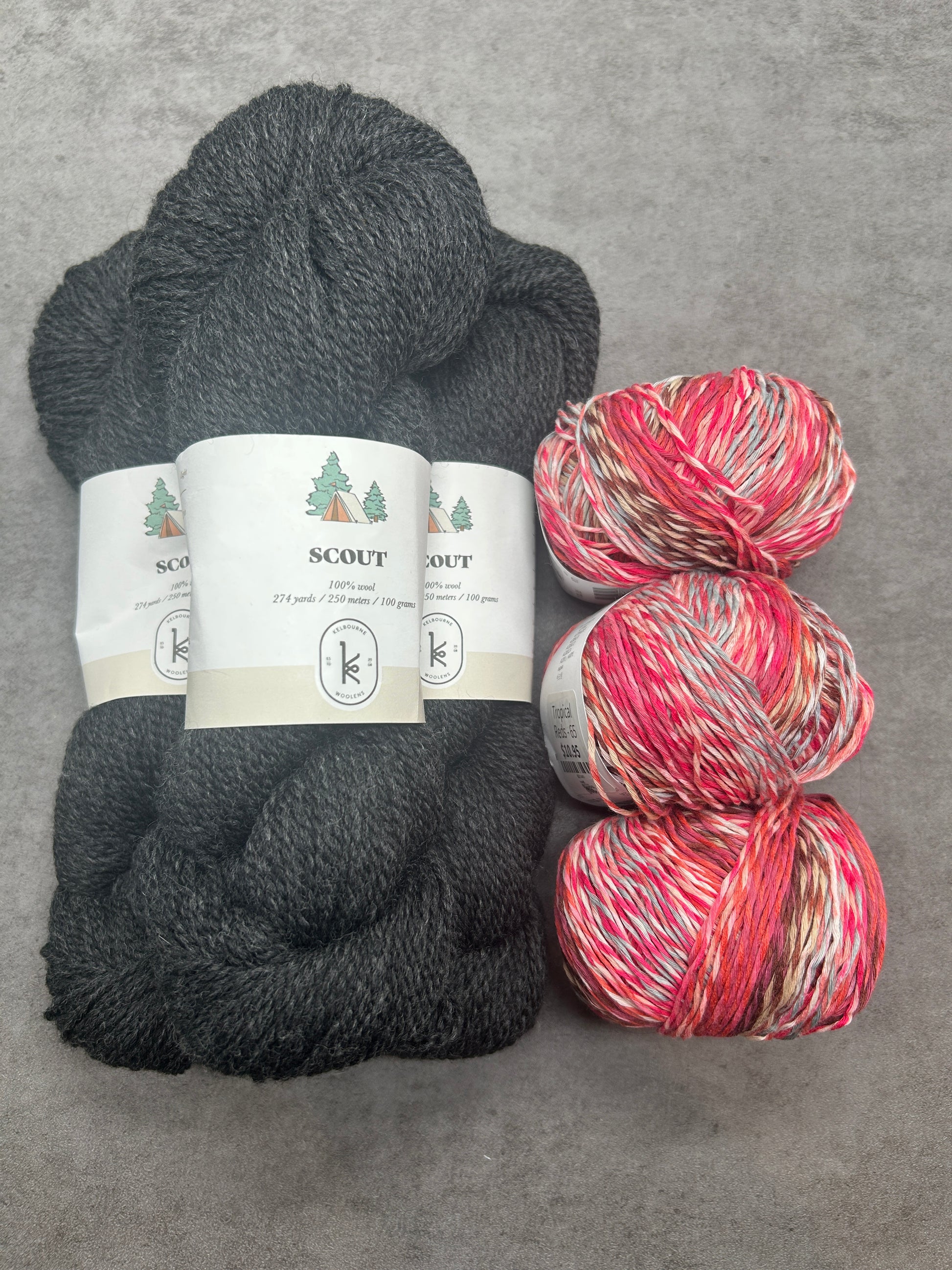 Kits include 3 skeins of Scout (100% wool) and 3 skeins of Fiesta (88% cotton & 12% nylon) or 3 skeins of Tropical (50% cotton, 50% acrylic).